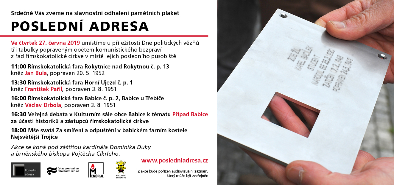 Ve čtvrtek 27. června 2019 v Den politických vězňů uctíme památku tří římskokatolických kněží odsouzených k trestu smrti ve vykonstruovaných procesech následujících po události, která je označována jako Případ Babice.V průběhu dne umístíme tři pamětní tabulky na farách v Rokytnici nad Rokytnou, Horním Újezdě a Babicích.Následovat bude veřejná debata v kulturním sále obce Babice k tématu Případ Babice. Více o akci zde